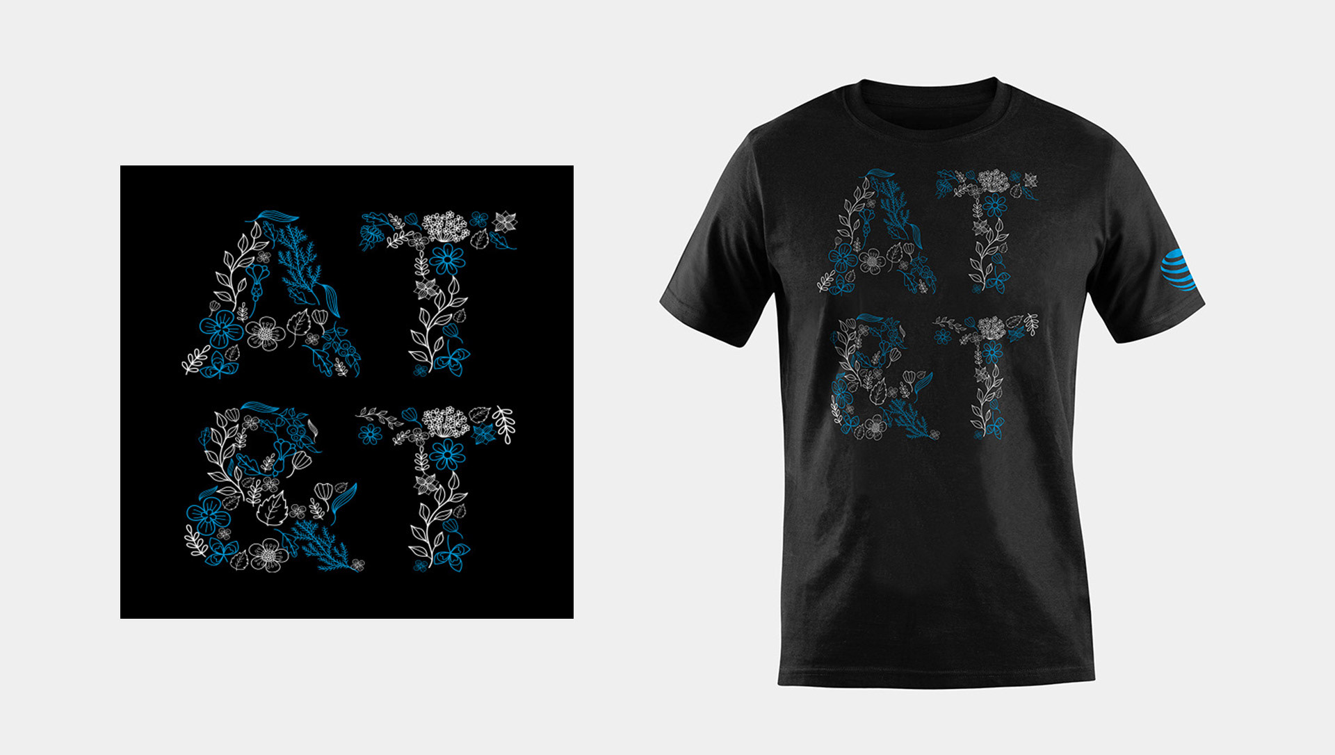I developed a design that reimagines the AT&T initials using intricate floral illustrations to form the letterforms. The organic shapes and limited color palette give the design a modern apparel aesthetic while creating a warmer, more human feel for the technology brand. The final artwork was created to work cleanly as a screen-printed graphic for employee merchandise.
